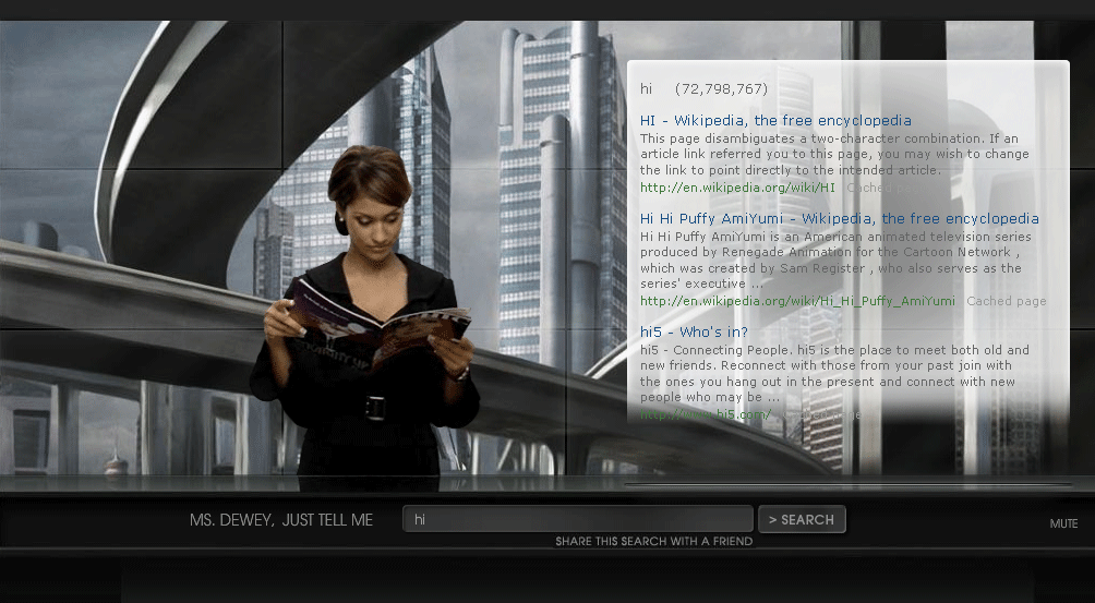 Hey, Do you know Ms. Dewey? No??? Okay I will introduce her. It is a search engine owned by Microsoft. The Ms. Dewey website is an Adobe Flash-based experimental interface for Windows Live Search. Ms. Dewey is a fully animated search assistant who audibly comments on searched keywords in her own style and makes random actions when idle.The role of the Ms. Dewey character is played by the famous American actruss Janina Gavankar. You need atleast medium speed internet connection to catch her.